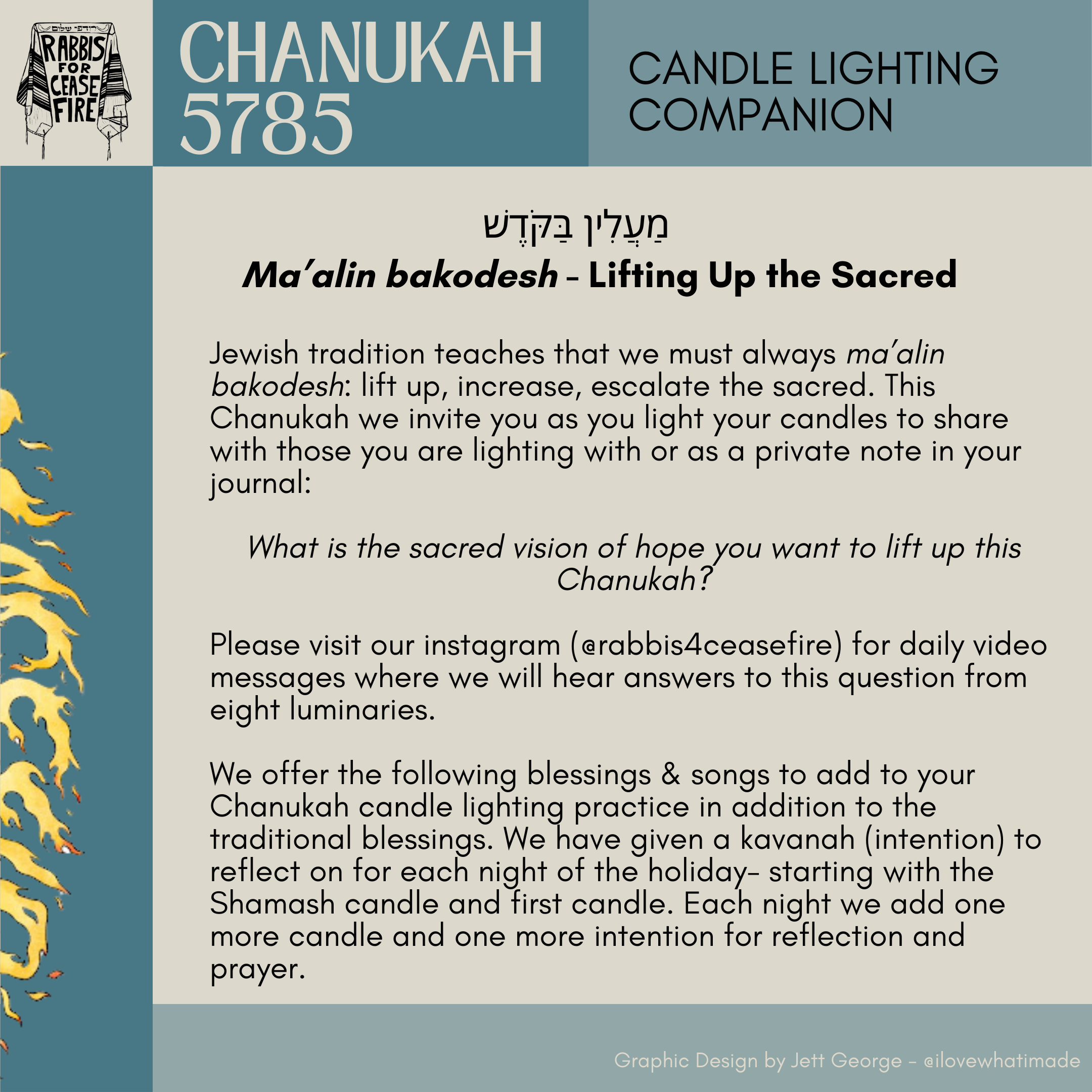 I was provided with the Rabbis for Ceasefire logo and the ceasefire menorah illustration. I decided to use the flames of the menorah as a motif throughout the guide on the left border of each page.